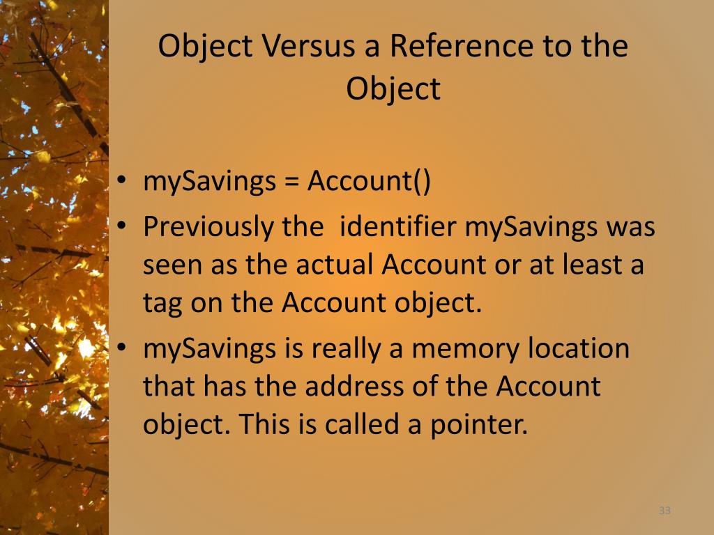 Object Versus a Reference to the Object • mySavings = Account() • Previously the identifier mySavings was seen as the actual Account or at least a tag on the Account object. • mySavings is really a memory location that has the address of the Account object. This is called a pointer.