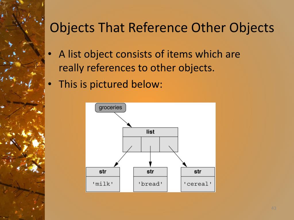 Objects That Reference Other Objects • A list object consists of items which are really references to other objects. • This is pictured below: