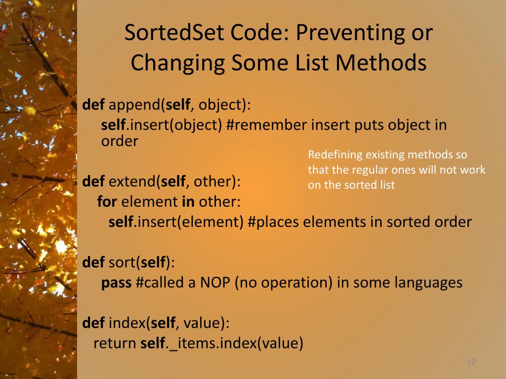 SortedSet Code: Preventing or Changing Some List Methods defappend(self, object): self.insert(object) #remember insert puts object in order defextend(self, other): for element in other: self.insert(element) #places elements in sorted order def sort(self): pass #called a NOP (no operation) in some languages defindex(self, value): return self._items.index(value) Redefining existing methods so that the regular ones will not work on the sorted list