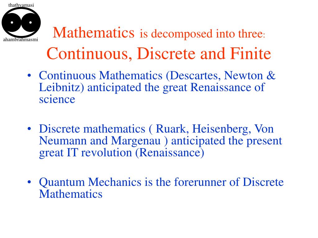 thathvamasi Mathematicsis decomposed into three: Continuous, Discrete and Finite ahambrahmasmi • Continuous Mathematics (Descartes, Newton & Leibnitz) anticipated the great Renaissance of science • Discrete mathematics ( Ruark, Heisenberg, Von Neumann and Margenau ) anticipated the present great IT revolution (Renaissance) • Quantum Mechanics is the forerunner of Discrete Mathematics