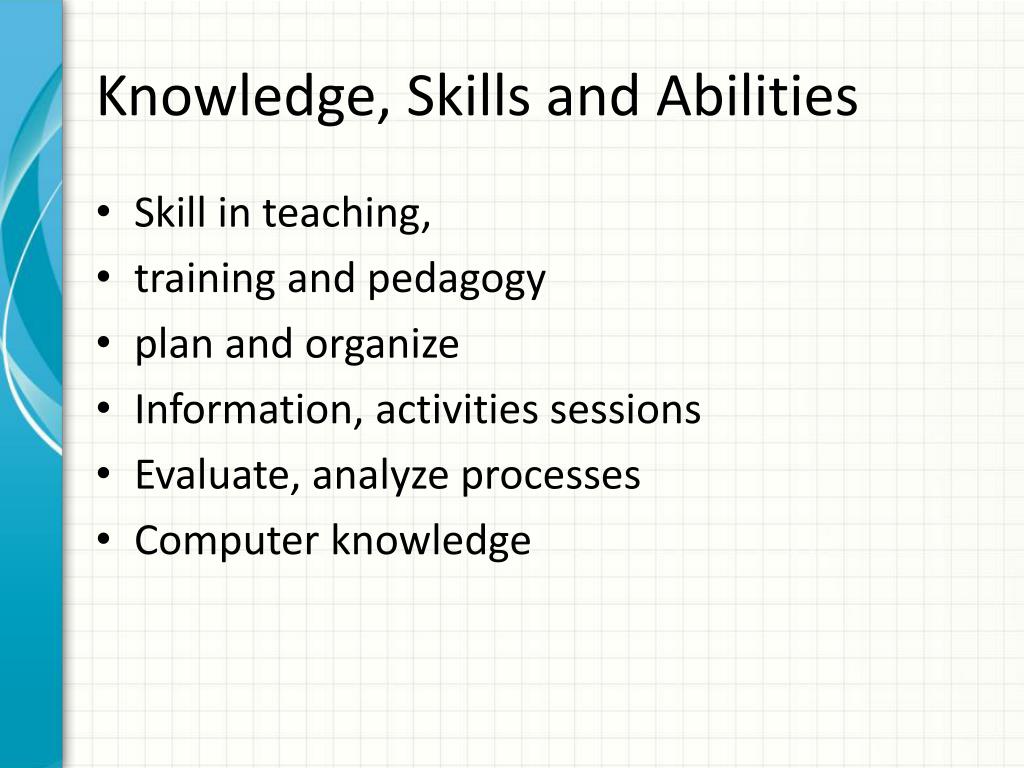 Knowledge, Skills and Abilities • Skill in teaching, • training and pedagogy • plan and organize • Information, activities sessions • Evaluate, analyze processes • Computer knowledge
