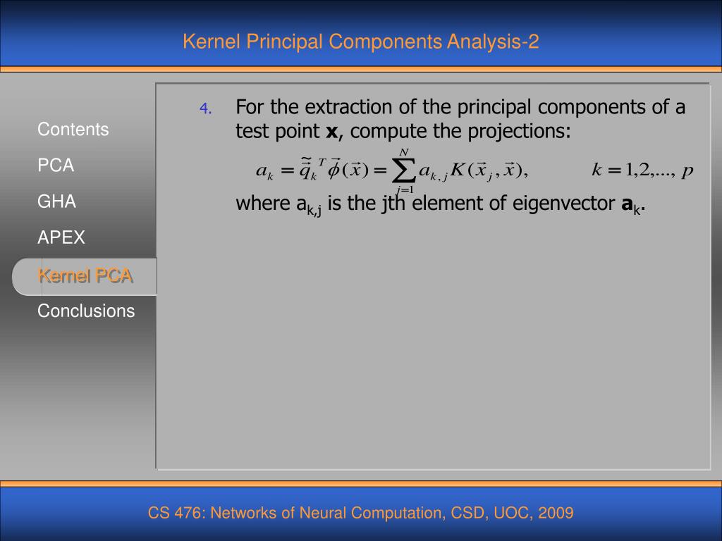 Kernel Principal Components Analysis-2 • For the extraction of the principal components of a test point x, compute the projections: • where ak,j is the jth element of eigenvector ak. Kernel PCA