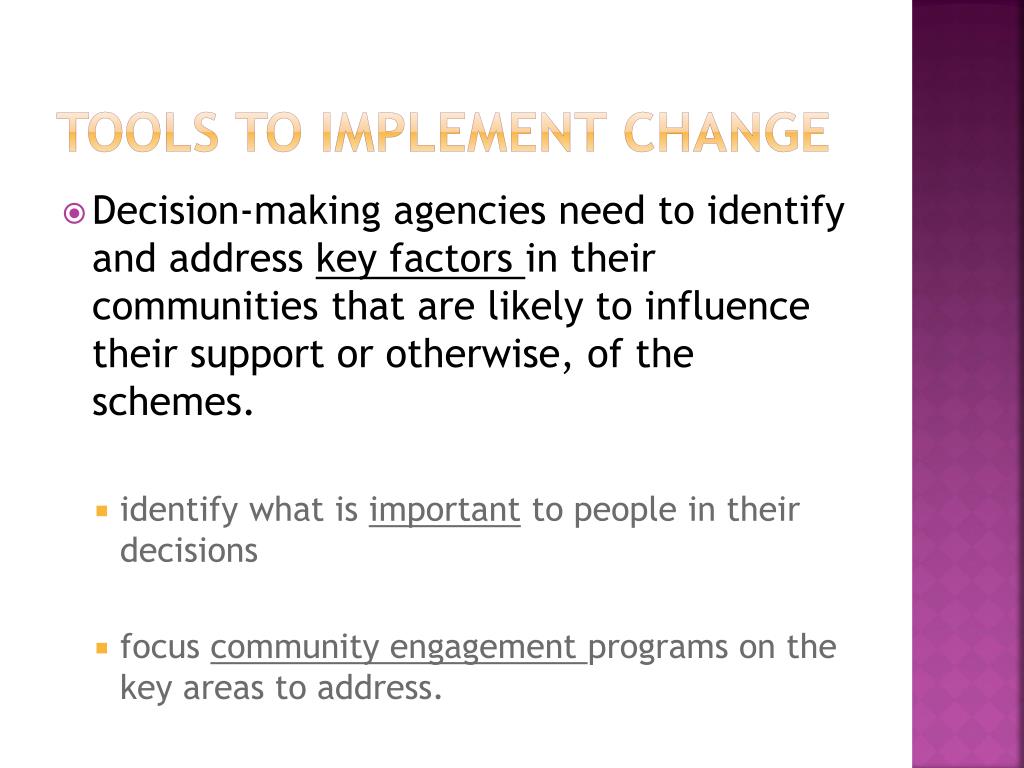 Tools to Implement Change • Decision-making agencies need to identify and address key factors in their communities that are likely to influence their support or otherwise, of the schemes. • identify what is important to people in their decisions • focus community engagement programs on the key areas to address.