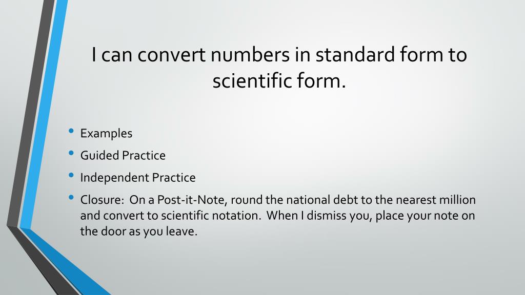 I can convert numbers in standard form to scientific form. Examples Guided Practice Independent Practice Closure: On a Post-it-Note, round the national debt to the nearest million and convert to scientific notation. When I dismiss you, place your note on the door as you leave.