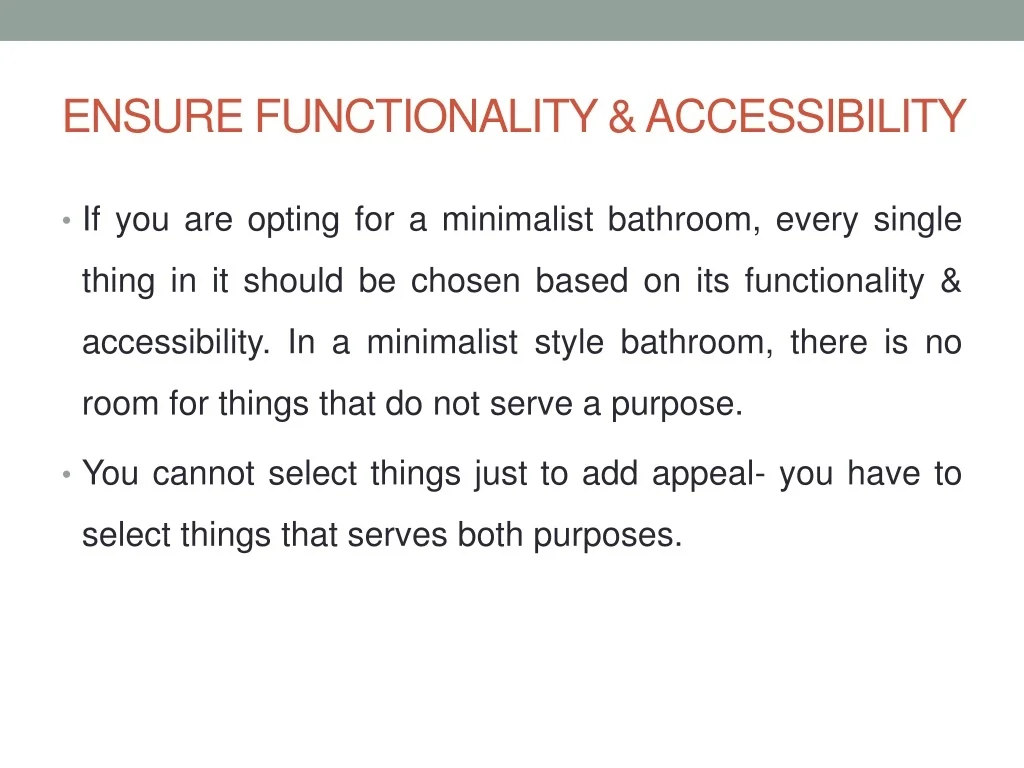 ENSURE FUNCTIONALITY & ACCESSIBILITY • If you are opting for a minimalist bathroom, every single thing in it should be chosen based on its functionality & accessibility. In a minimalist style bathroom, there is no room for things that do not serve a purpose. • You cannot select things just to add appeal- you have to select things that serves both purposes.