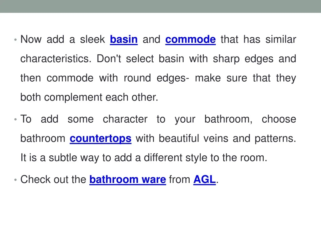Now add a sleek basin and commode that has similar characteristics. Don't select basin with sharp edges and then commode with round edges- make sure that they both complement each other. To add some character to your bathroom, choose bathroom countertops with beautiful veins and patterns. It is a subtle way to add a different style to the room. Check out the bathroom ware from AGL.
