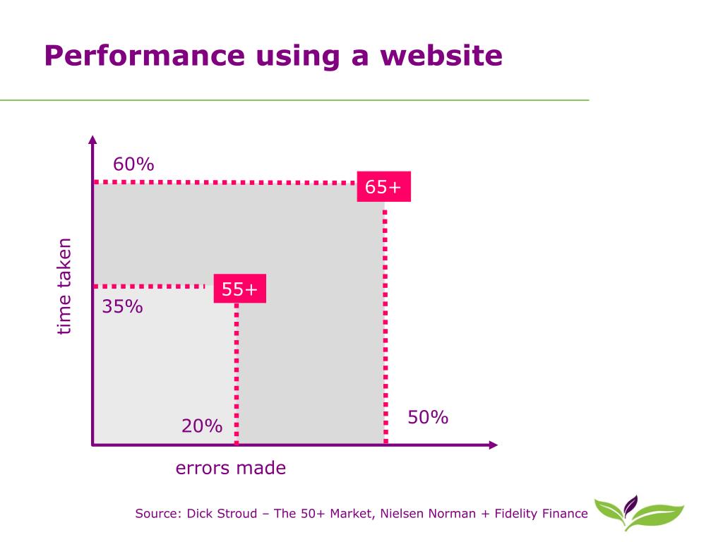 60% 65+ time taken 55+ 35% 50% 20% errors made Performance using a website Source: Dick Stroud – The 50+ Market, Nielsen Norman + Fidelity Finance