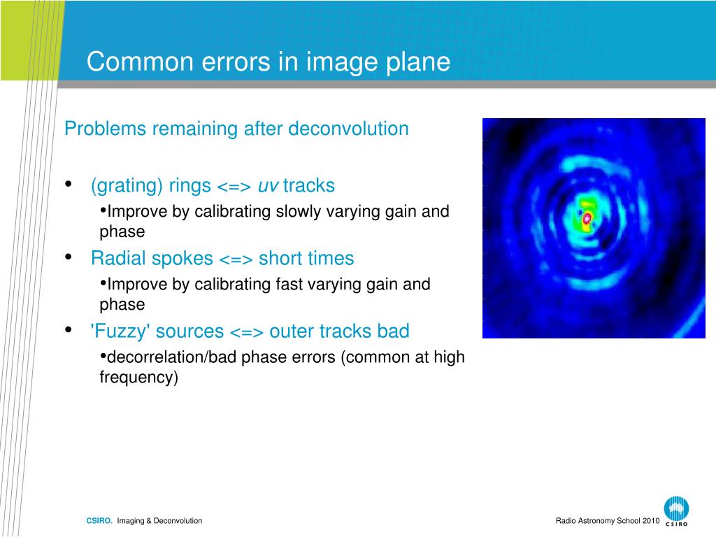 Common errors in image plane • Problems remaining after deconvolution • (grating) rings <=> uv tracks • Improve by calibrating slowly varying gain and phase • Radial spokes <=> short times • Improve by calibrating fast varying gain and phase • 'Fuzzy' sources <=> outer tracks bad • decorrelation/bad phase errors (common at high frequency) CSIRO. Imaging & Deconvolution Radio Astronomy School 2010