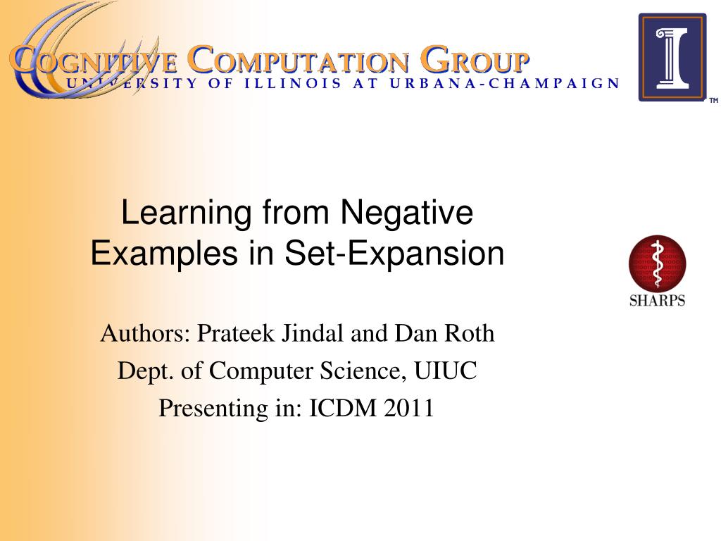 Learning from Negative Examples in Set-Expansion Authors: Prateek Jindal and Dan Roth Dept. of Computer Science, UIUC Presenting in: ICDM 2011