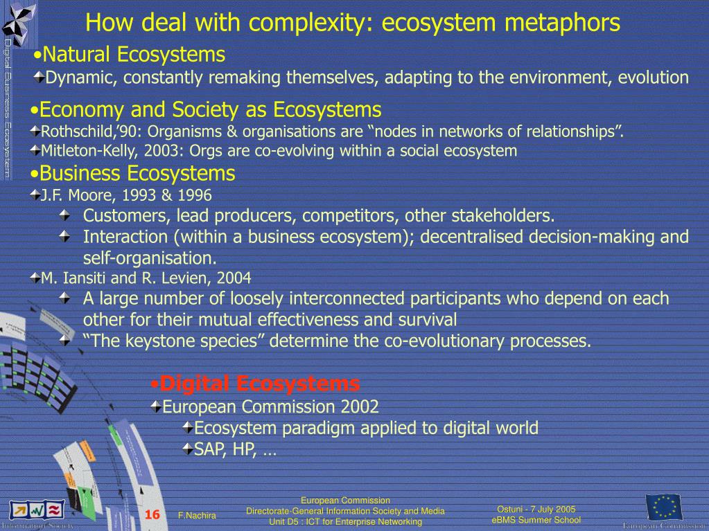 How deal with complexity: ecosystem metaphors • Natural Ecosystems • Dynamic, constantly remaking themselves, adapting to the environment, evolution • Economy and Society as Ecosystems • Rothschild,’90: Organisms & organisations are “nodes in networks of relationships”. • Mitleton-Kelly, 2003: Orgs are co-evolving within a social ecosystem • Business Ecosystems • J.F. Moore, 1993 & 1996 • Customers, lead producers, competitors, other stakeholders. • Interaction (within a business ecosystem); decentralised decision-making and self-organisation. • M. Iansiti and R. Levien, 2004 • A large number of loosely interconnected participants who depend on each other for their mutual effectiveness and survival • “The keystone species” determine the co-evolutionary processes. • Digital Ecosystems • European Commission 2002 • Ecosystem paradigm applied to digital world • SAP, HP, …