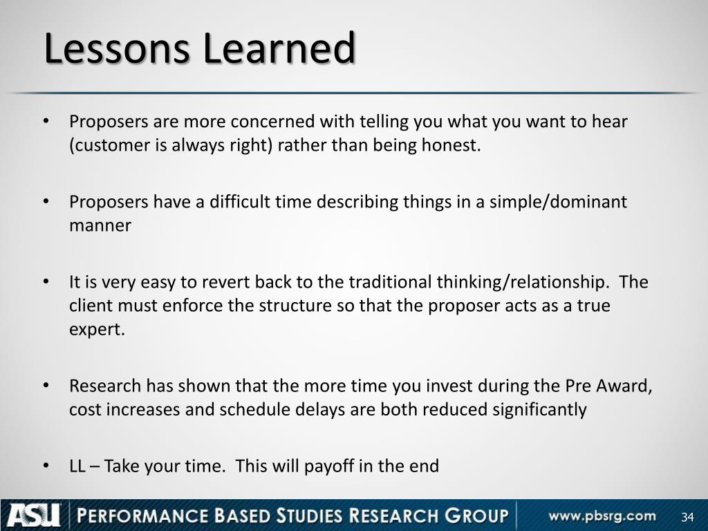 Lessons Learned Proposers are more concerned with telling you what you want to hear (customer is always right) rather than being honest. Proposers have a difficult time describing things in a simple/dominant manner It is very easy to revert back to the traditional thinking/relationship. The client must enforce the structure so that the proposer acts as a true expert. Research has shown that the more time you invest during the Pre Award, cost increases and schedule delays are both reduced significantly LL – Take your time. This will payoff in the end 34