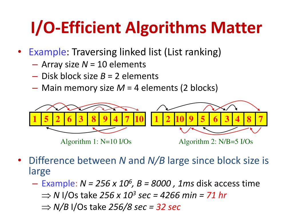I/O-Efficient Algorithms Matter • Example: Traversing linked list (List ranking) • Array size N = 10 elements • Disk block size B = 2 elements • Main memory size M = 4 elements (2 blocks) • Difference between N and N/B large since block size is large • Example: N = 256 x 106, B = 8000 , 1ms disk access time N I/Os take 256 x 103 sec = 4266 min = 71 hr N/B I/Os take 256/8 sec = 32 sec 1 5 2 6 3 8 9 4 10 1 2 10 9 5 6 3 4 7 7 8 Algorithm 1: N=10 I/Os Algorithm 2: N/B=5 I/Os