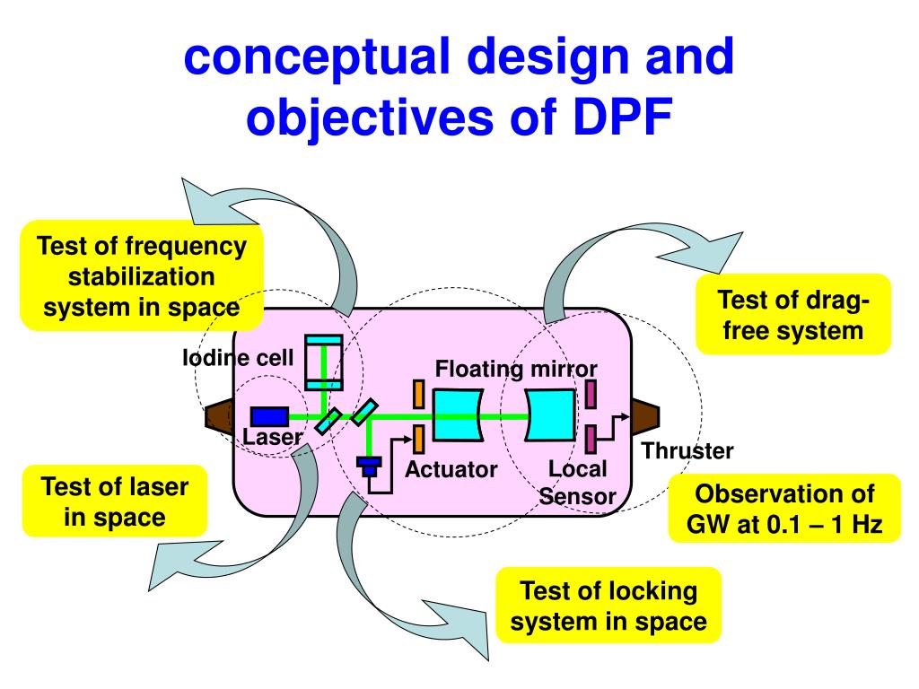 Test of frequency stabilization system in space Test of drag-free system Test of laser in space Test of locking system in space conceptual design and objectives of DPF Iodine cell Floating mirror Laser Thruster Local Sensor Actuator Observation of GW at 0.1 – 1 Hz