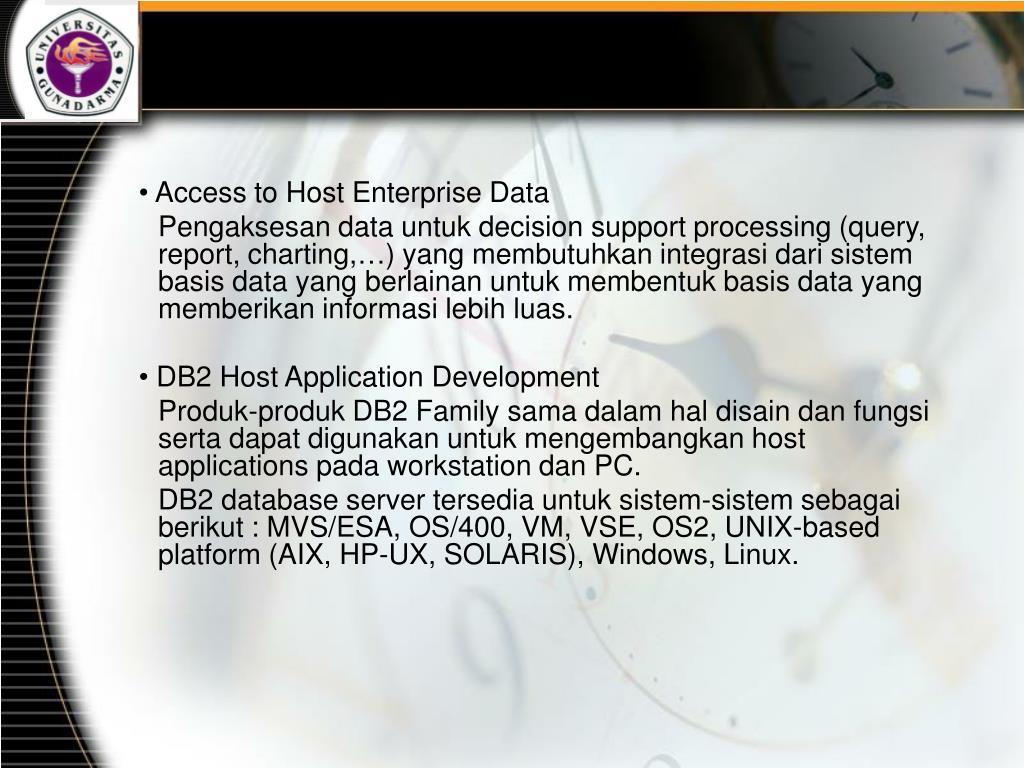 • Access to Host Enterprise Data Pengaksesan data untuk decision support processing (query, report, charting,…) yang membutuhkan integrasi dari sistem basis data yang berlainan untuk membentuk basis data yang memberikan informasi lebih luas. • DB2 Host Application Development Produk-produk DB2 Family sama dalam hal disain dan fungsi serta dapat digunakan untuk mengembangkan host applications pada workstation dan PC. DB2 database server tersedia untuk sistem-sistem sebagai berikut : MVS/ESA, OS/400, VM, VSE, OS2, UNIX-based platform (AIX, HP-UX, SOLARIS), Windows, Linux.