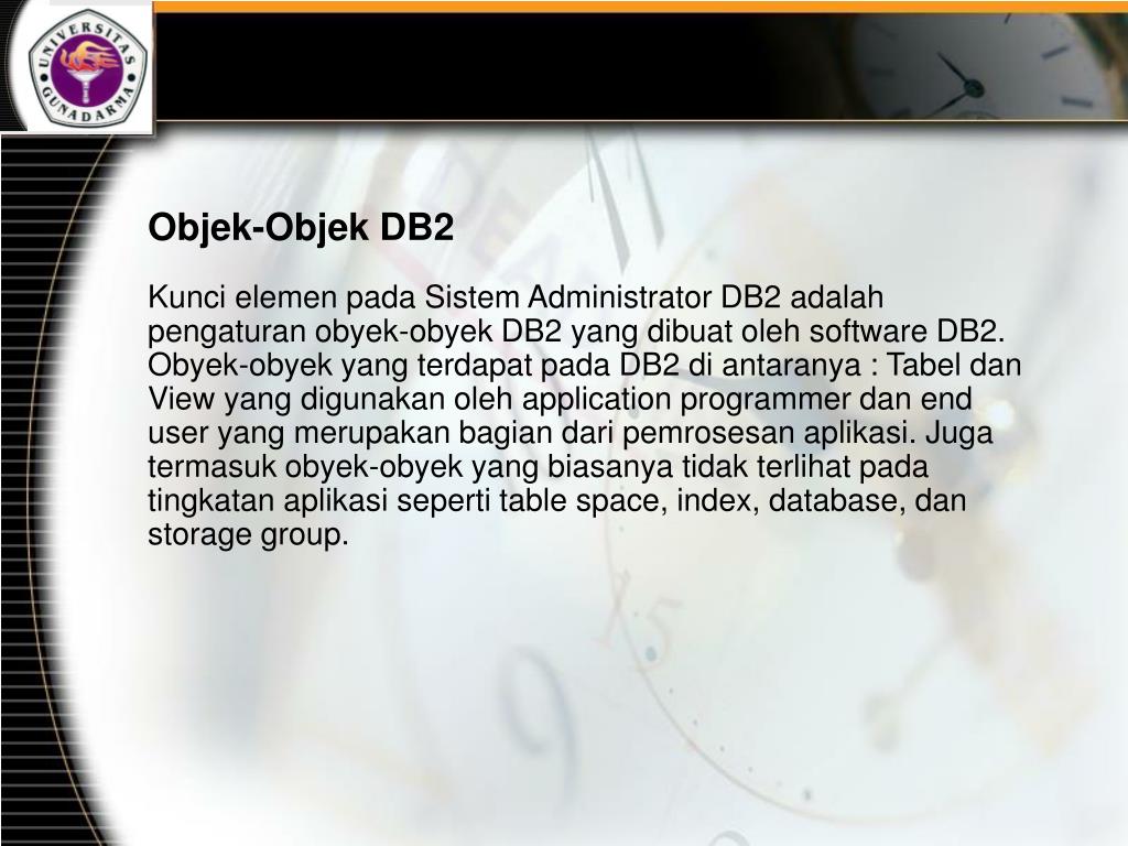 Objek-Objek DB2 Kunci elemen pada Sistem Administrator DB2 adalah pengaturan obyek-obyek DB2 yang dibuat oleh software DB2. Obyek-obyek yang terdapat pada DB2 di antaranya : Tabel dan View yang digunakan oleh application programmer dan end user yang merupakan bagian dari pemrosesan aplikasi. Juga termasuk obyek-obyek yang biasanya tidak terlihat pada tingkatan aplikasi seperti table space, index, database, dan storage group.