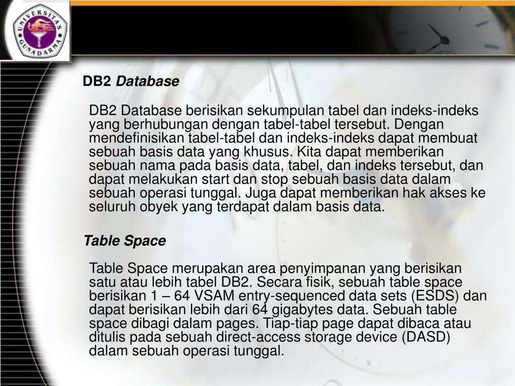 DB2 Database DB2 Database berisikan sekumpulan tabel dan indeks-indeks yang berhubungan dengan tabel-tabel tersebut. Dengan mendefinisikan tabel-tabel dan indeks-indeks dapat membuat sebuah basis data yang khusus. Kita dapat memberikan sebuah nama pada basis data, tabel, dan indeks tersebut, dan dapat melakukan start dan stop sebuah basis data dalam sebuah operasi tunggal. Juga dapat memberikan hak akses ke seluruh obyek yang terdapat dalam basis data. Table Space Table Space merupakan area penyimpanan yang berisikan satu atau lebih tabel DB2. Secara fisik, sebuah table space berisikan 1 – 64 VSAM entry-sequenced data sets (ESDS) dan dapat berisikan lebih dari 64 gigabytes data. Sebuah table space dibagi dalam pages. Tiap-tiap page dapat dibaca atau ditulis pada sebuah direct-access storage device (DASD) dalam sebuah operasi tunggal.