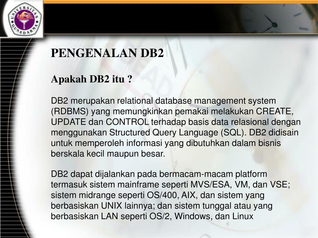 PENGENALAN DB2 Apakah DB2 itu ? DB2 merupakan relational database management system (RDBMS) yang memungkinkan pemakai melakukan CREATE, UPDATE dan CONTROL terhadap basis data relasional dengan menggunakan Structured Query Language (SQL). DB2 didisain untuk memperoleh informasi yang dibutuhkan dalam bisnis berskala kecil maupun besar. DB2 dapat dijalankan pada bermacam-macam platform termasuk sistem mainframe seperti MVS/ESA, VM, dan VSE; sistem midrange seperti OS/400, AIX, dan sistem yang berbasiskan UNIX lainnya; dan sistem tunggal atau yang berbasiskan LAN seperti OS/2, Windows, dan Linux