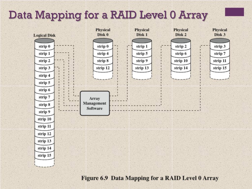 Consists of 7 levels • Levels do not imply a hierarchical relationship but designate different design architectures that share three common characteristics: • Set of physical disk drives viewed by the operating system as a single logical drive • Data are distributed across the physical drives of an array in a scheme known as striping • Redundant disk capacity is used to store parity information, which guarantees data recoverability in case of a disk failure RAID Redundant Array of Independent Disks