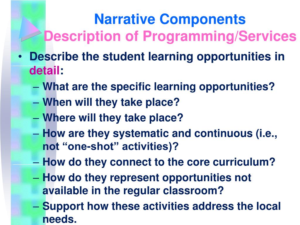 Narrative ComponentsDescription of Programming/Services • Describe the student learning opportunities in detail: • What are the specific learning opportunities? • When will they take place? • Where will they take place? • How are they systematic and continuous (i.e., not “one-shot” activities)? • How do they connect to the core curriculum? • How do they represent opportunities not available in the regular classroom? • Support how these activities address the local needs.