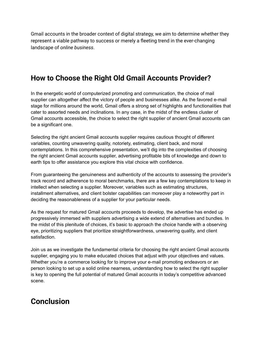 Gmail accounts in the broader context of digital strategy, we aim to determine whether they represent a viable pathway to success or merely a fleeting trend in the ever-changing landscape of online business. How to Choose the Right Old Gmail Accounts Provider? In the energetic world of computerized promoting and communication, the choice of mail supplier can altogether affect the victory of people and businesses alike. As the favored e-mail stage for millions around the world, Gmail offers a strong set of highlights and functionalities that cater to assorted needs and inclinations. In any case, in the midst of the endless cluster of Gmail accounts accessible, the choice to select the right supplier of ancient Gmail accounts can be a significant one. Selecting the right ancient Gmail accounts supplier requires cautious thought of different variables, counting unwavering quality, notoriety, estimating, client back, and moral contemplations. In this comprehensive presentation, we’ll dig into the complexities of choosing the right ancient Gmail accounts supplier, advertising profitable bits of knowledge and down to earth tips to offer assistance you explore this vital choice with confidence. From guaranteeing the genuineness and authenticity of the accounts to assessing the provider’s track record and adherence to moral benchmarks, there are a few key contemplations to keep in intellect when selecting a supplier. Moreover, variables such as estimating structures, installment alternatives, and client bolster capabilities can moreover play a noteworthy part in deciding the reasonableness of a supplier for your particular needs. As the request for matured Gmail accounts proceeds to develop, the advertise has ended up progressively immersed with suppliers advertising a wide extend of alternatives and bundles. In the midst of this plenitude of choices, it’s basic to approach the choice handle with a observing eye, prioritizing suppliers that prioritize straightforwardness, unwavering quality, and client satisfaction. Join us as we investigate the fundamental criteria for choosing the right ancient Gmail accounts supplier, engaging you to make educated choices that adjust with your objectives and values. Whether you’re a commerce looking for to improve your e-mail promoting endeavors or an person looking to set up a solid online nearness, understanding how to select the right supplier is key to opening the full potential of matured Gmail accounts in today’s competitive advanced scene. Conclusion