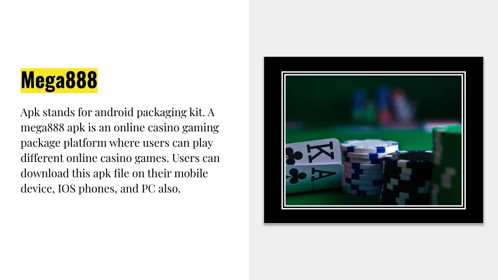 Mega888 Apk stands for android packaging kit. A mega888 apk is an online casino gaming package platform where users can play different online casino games. Users can download this apk file on their mobile device, IOS phones, and PC also.