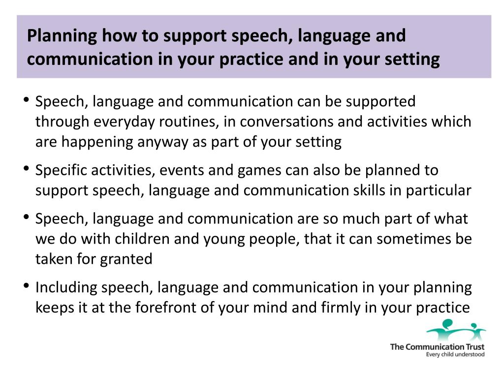 Planning how to support speech, language and communication in your practice and in your setting • Speech, language and communication can be supported through everyday routines, in conversations and activities which are happening anyway as part of your setting • Specific activities, events and games can also be planned to support speech, language and communication skills in particular • Speech, language and communication are so much part of what we do with children and young people, that it can sometimes be taken for granted • Including speech, language and communication in your planning keeps it at the forefront of your mind and firmly in your practice