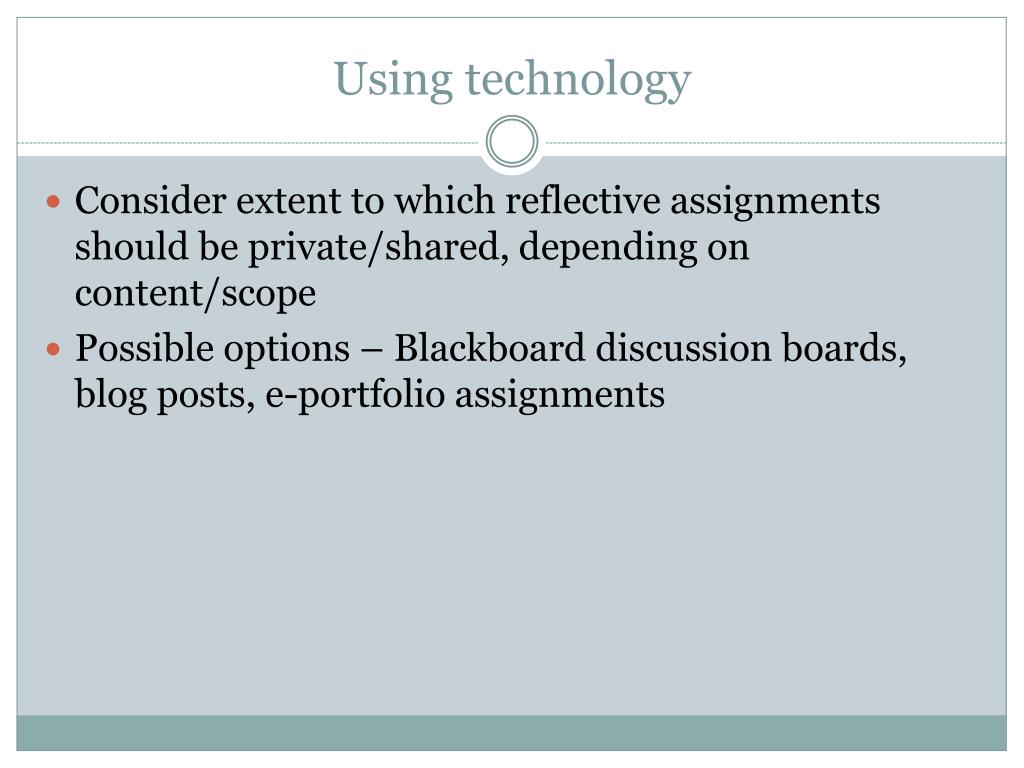 Using technology Consider extent to which reflective assignments should be private/shared, depending on content/scope Possible options – Blackboard discussion boards, blog posts, e-portfolio assignments