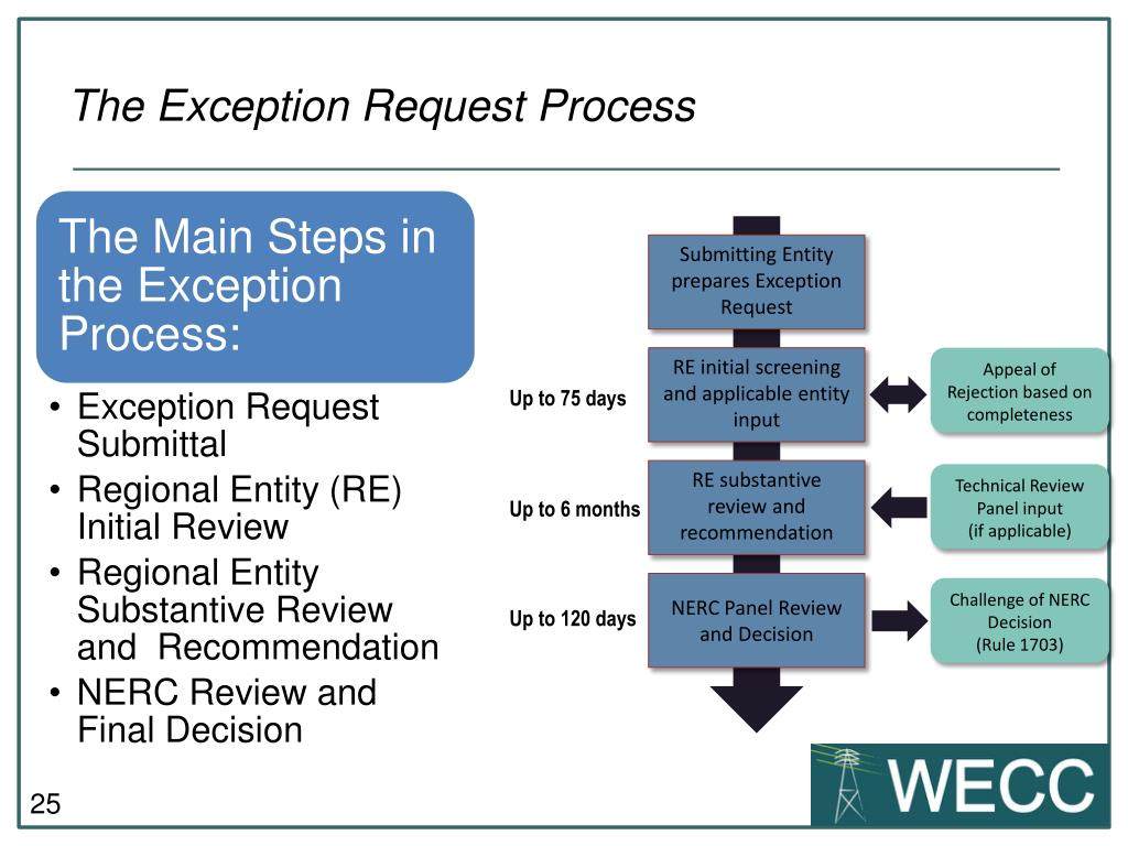 The Exception Request Process Submitting Entity prepares Exception Request RE initial screening and applicable entity input Appeal of Rejection based on completeness Up to 75 days RE substantive review and recommendation Technical Review Panel input (if applicable) Up to 6 months NERC Panel Review and Decision Challenge of NERC Decision (Rule 1703) Up to 120 days