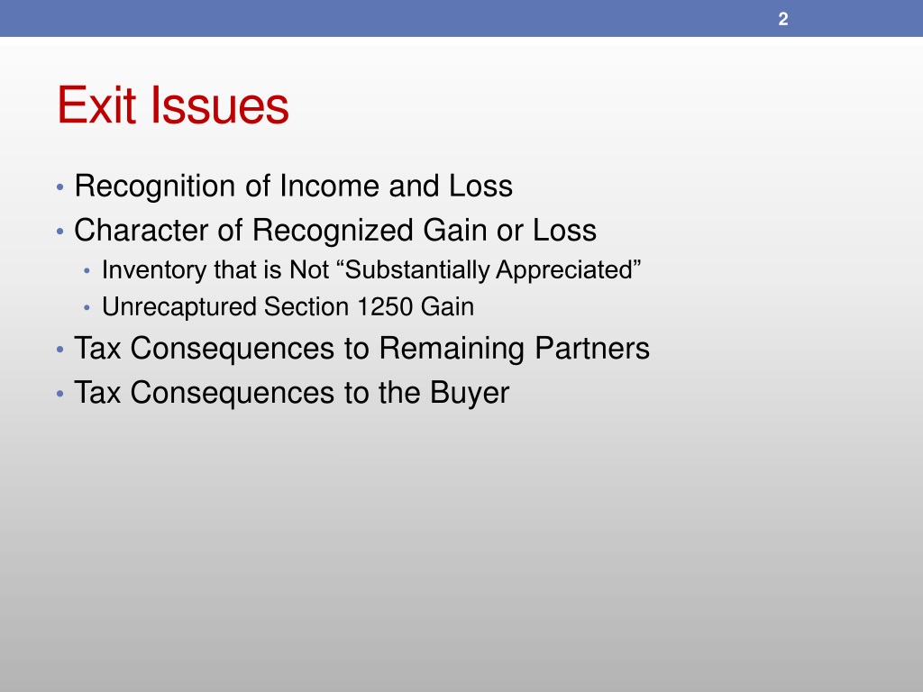 Exit Issues • Recognition of Income and Loss • Character of Recognized Gain or Loss • Inventory that is Not “Substantially Appreciated” • Unrecaptured Section 1250 Gain • Tax Consequences to Remaining Partners • Tax Consequences to the Buyer