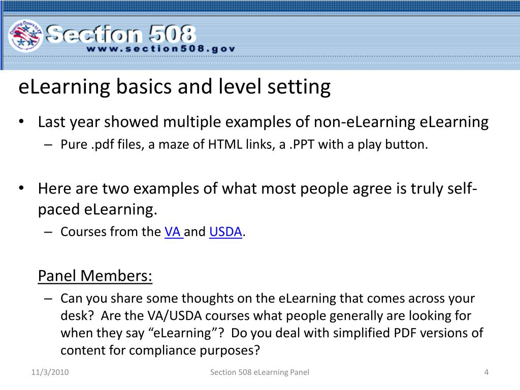 eLearning basics and level setting • Last year showed multiple examples of non-eLearning eLearning • Pure .pdf files, a maze of HTML links, a .PPT with a play button. • Here are two examples of what most people agree is truly self-paced eLearning. • Courses from the VA and USDA. Panel Members: • Can you share some thoughts on the eLearning that comes across your desk? Are the VA/USDA courses what people generally are looking for when they say “eLearning”? Do you deal with simplified PDF versions of content for compliance purposes? Section 508 eLearning Panel