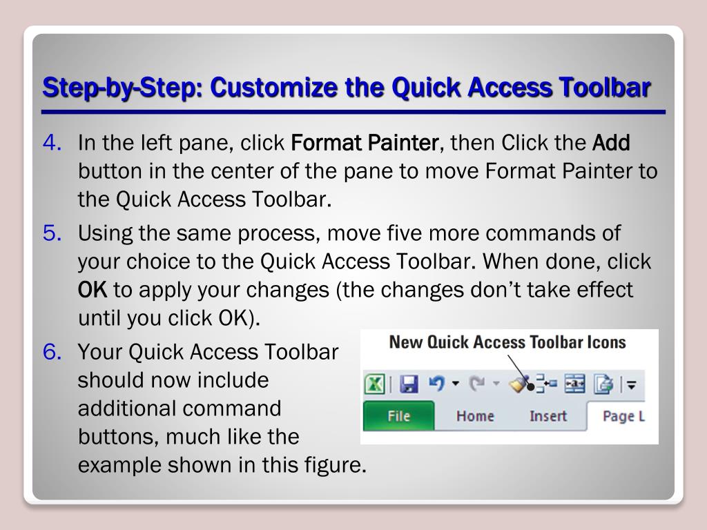 Step-by-Step: Customize the Quick Access Toolbar • In the left pane, click Format Painter, then Click the Add button in the center of the pane to move Format Painter to the Quick Access Toolbar. • Using the same process, move five more commands of your choice to the Quick Access Toolbar. When done, click OK to apply your changes (the changes don’t take effect until you click OK). • Your Quick Access Toolbarshould now include additional command buttons, much like the example shown in this figure.