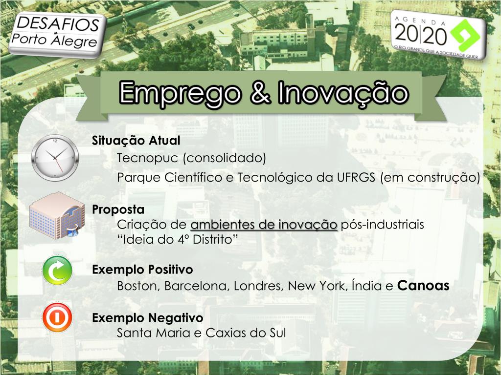Situação Atual • Tecnopuc (consolidado) • Parque Científico e Tecnológico da UFRGS (em construção) • Proposta • Criação de ambientes de inovaçãopós-industriais • “Ideia do 4º Distrito” • Exemplo Positivo • Boston, Barcelona, Londres, New York, Índia e Canoas • Exemplo Negativo • Santa Maria e Caxias do Sul