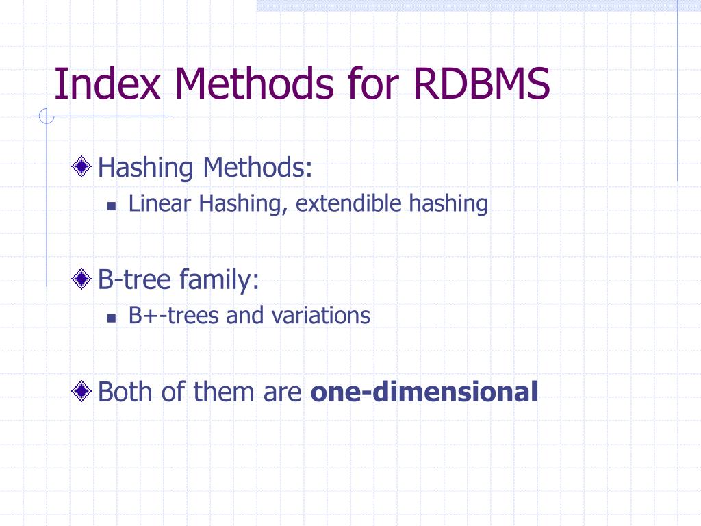 Index Methods for RDBMS • Hashing Methods: • Linear Hashing, extendible hashing • B-tree family: • B+-trees and variations • Both of them are one-dimensional