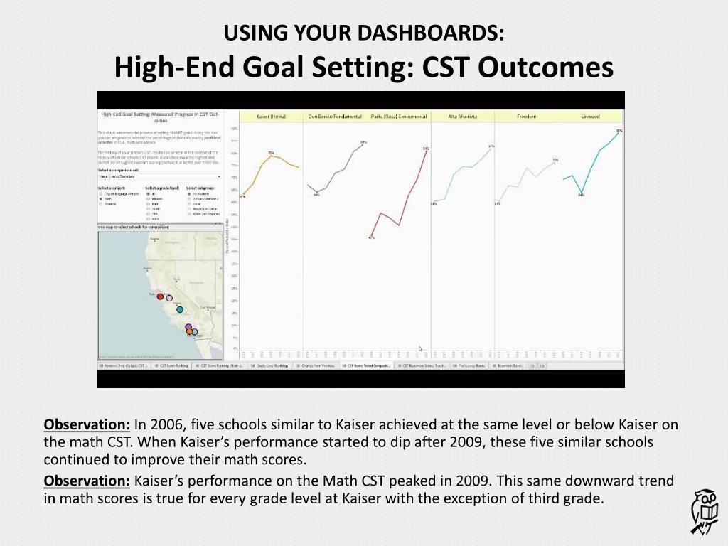 USING YOUR DASHBOARDS: High-End Goal Setting: CST Outcomes Observation:In 2006, five schools similar to Kaiser achieved at the same level or below Kaiser on the math CST. When Kaiser’s performance started to dip after 2009, these five similar schools continued to improve their math scores. Observation:Kaiser’s performance on the Math CST peaked in 2009. This same downward trend in math scores is true for every grade level at Kaiser with the exception of third grade.