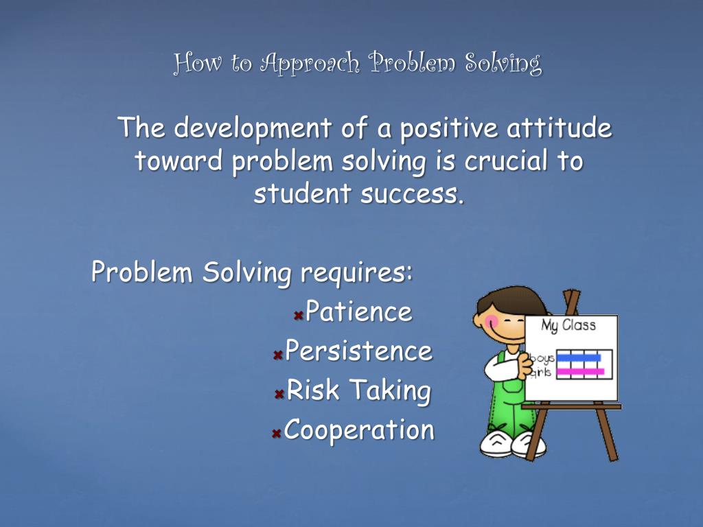 The development of a positive attitude toward problem solving is crucial to student success. Problem Solving requires: • Patience • Persistence • Risk Taking • Cooperation How to Approach Problem Solving