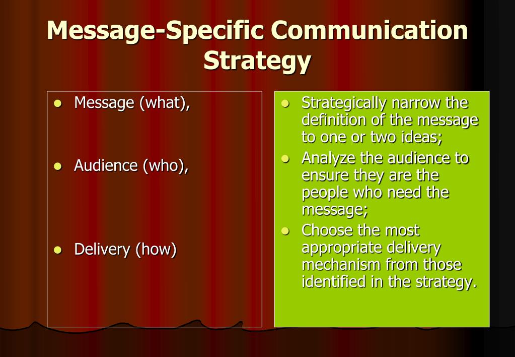 Message (what), Audience (who), Delivery (how) Strategically narrow the definition of the message to one or two ideas; Analyze the audience to ensure they are the people who need the message; Choose the most appropriate delivery mechanism from those identified in the strategy. Message-Specific Communication Strategy
