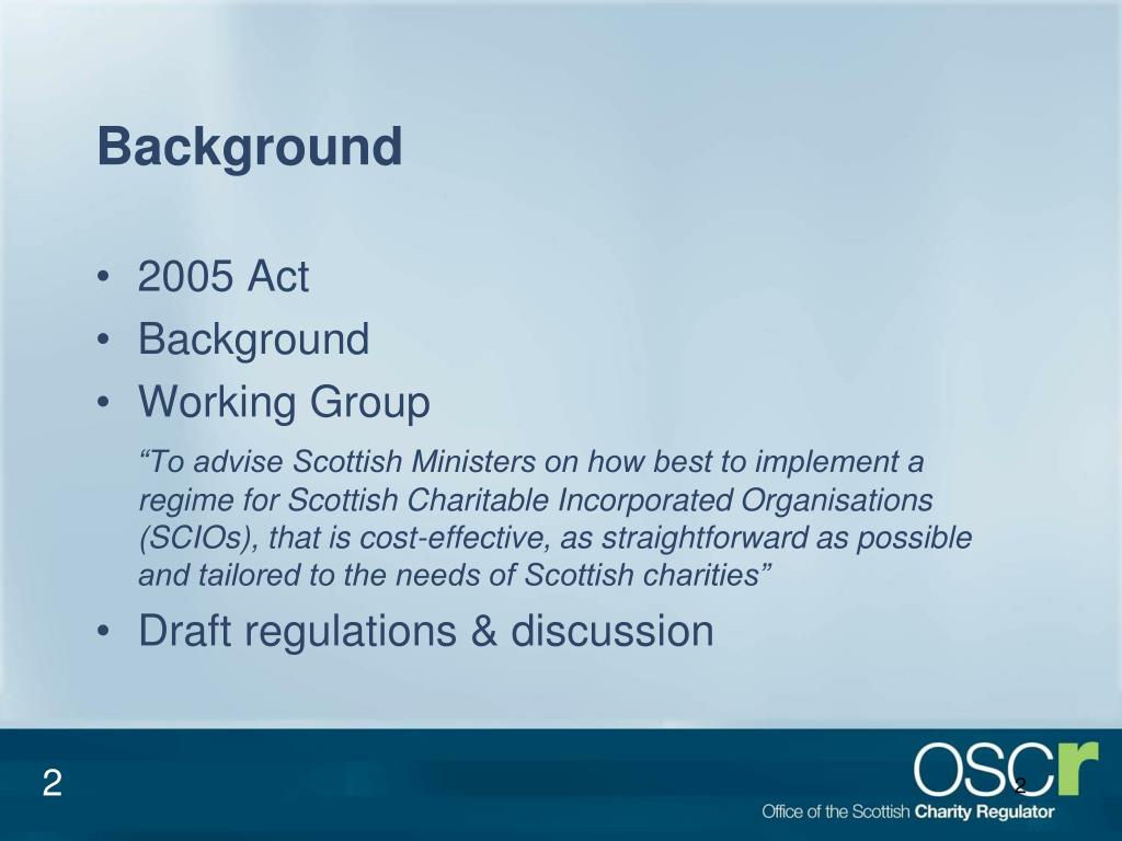 Background • 2005 Act • Background • Working Group “To advise Scottish Ministers on how best to implement a regime for Scottish Charitable Incorporated Organisations (SCIOs), that is cost-effective, as straightforward as possible and tailored to the needs of Scottish charities” • Draft regulations & discussion 2