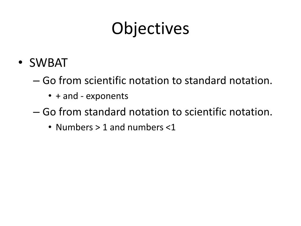 Objectives • SWBAT • Go from scientific notation to standard notation. • + and - exponents • Go from standard notation to scientific notation. • Numbers > 1 and numbers <1