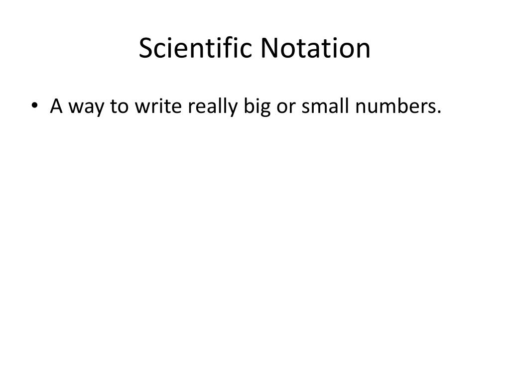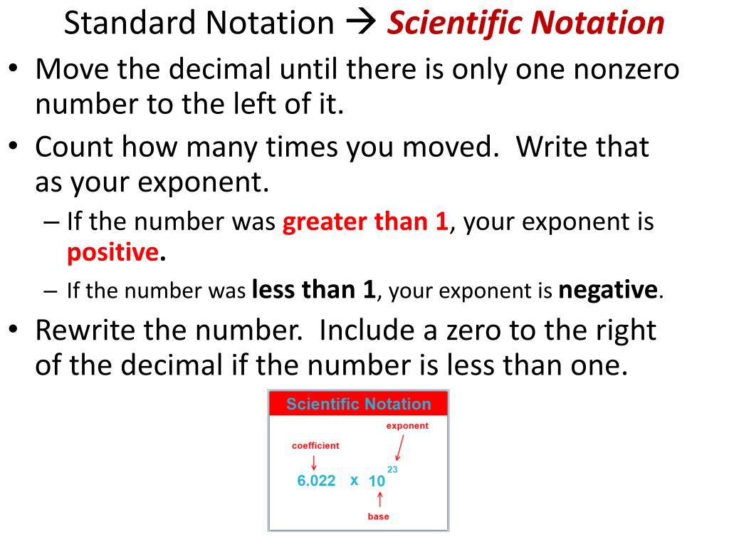 Standard Notation Scientific Notation • Move the decimal until there is only one nonzero number to the left of it. • Count how many times you moved. Write that as your exponent. • If the number was greater than 1, your exponent is positive. • If the number was less than 1, your exponent is negative. • Rewrite the number. Include a zero to the right of the decimal if the number is less than one.