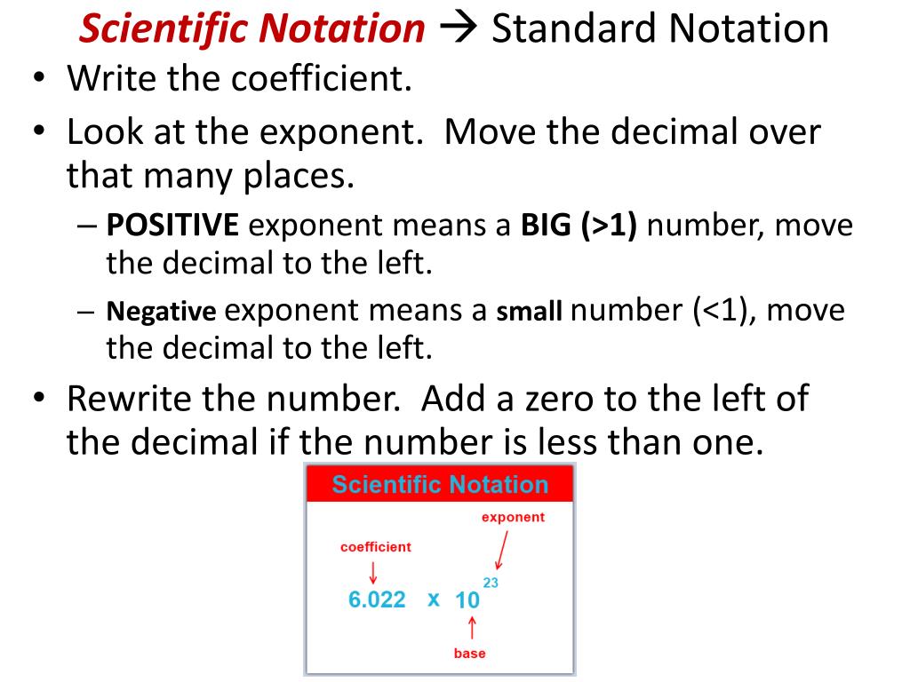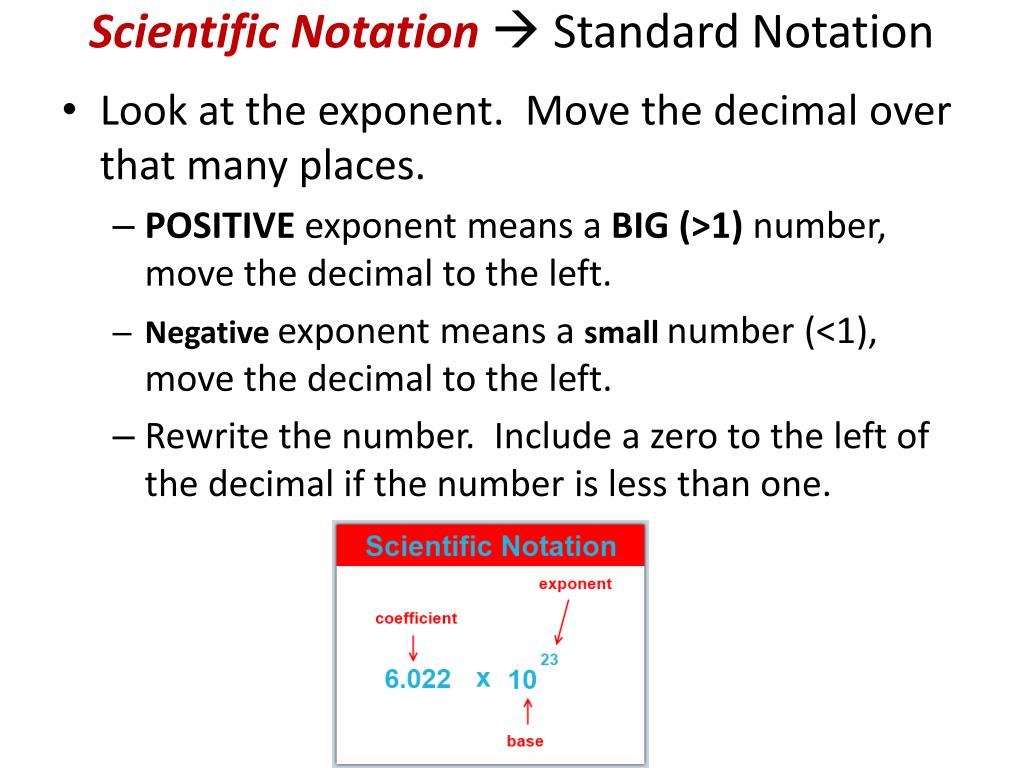 Scientific Notation Standard Notation • Write the coefficient. • Look at the exponent. Move the decimal over that many places. • POSITIVE exponent means a BIG (>1) number, move the decimal to the left. • Negativeexponent means a smallnumber (<1), move the decimal to the left. • Rewrite the number. Add a zero to the left of the decimal if the number is less than one.