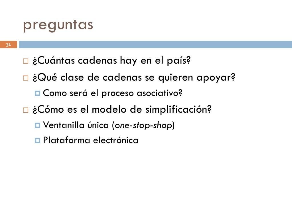 preguntas • ¿Cuántas cadenas hay en el país? • ¿Qué clase de cadenas se quieren apoyar? • Como será el proceso asociativo? • ¿Cómo es el modelo de simplificación? • Ventanilla única (one-stop-shop) • Plataforma electrónica