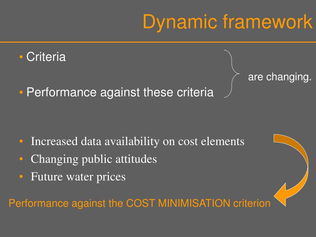 Dynamic framework • Criteria • Performance against these criteria are changing. • Increased data availability on cost elements • Changing public attitudes • Future water prices Performance against the COST MINIMISATION criterion