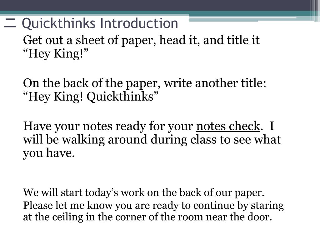 二 Quickthinks Introduction Get out a sheet of paper, head it, and title it “Hey King!” On the back of the paper, write another title: “Hey King! Quickthinks” Have your notes ready for your notes check. I will be walking around during class to see what you have. We will start today’s work on the back of our paper. Please let me know you are ready to continue by staring at the ceiling in the corner of the room near the door.