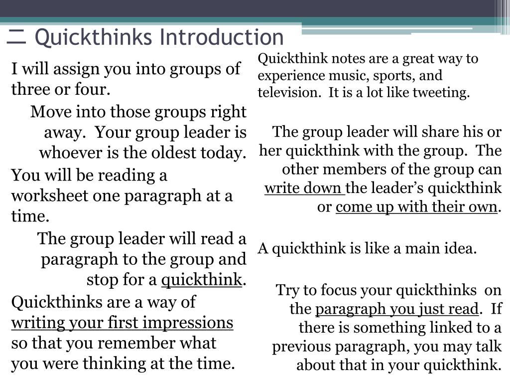 I will assign you into groups of three or four. Move into those groups right away. Your group leader is whoever is the oldest today. You will be reading a worksheet one paragraph at a time. The group leader will read a paragraph to the group and stop for a quickthink. Quickthinks are a way of writing your first impressions so that you remember what you were thinking at the time. Quickthink notes are a great way to experience music, sports, and television. It is a lot like tweeting. The group leader will share his or her quickthink with the group. The other members of the group can write down the leader’s quickthink or come up with their own. A quickthink is like a main idea. Try to focus your quickthinks on the paragraph you just read. If there is something linked to a previous paragraph, you may talk about that in your quickthink. 二 Quickthinks Introduction