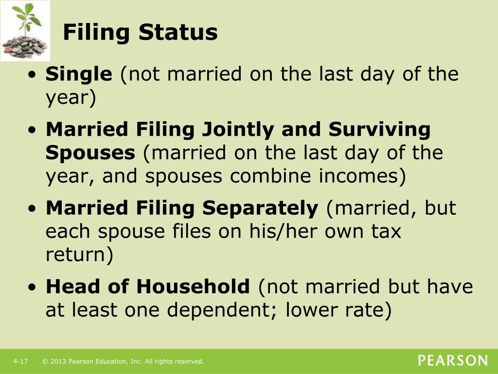 Filing Status • Single (not married on the last day of the year) • Married Filing Jointly and Surviving Spouses (married on the last day of the year, and spouses combine incomes) • Married Filing Separately (married, but each spouse files on his/her own tax return) • Head of Household (not married but have at least one dependent; lower rate)