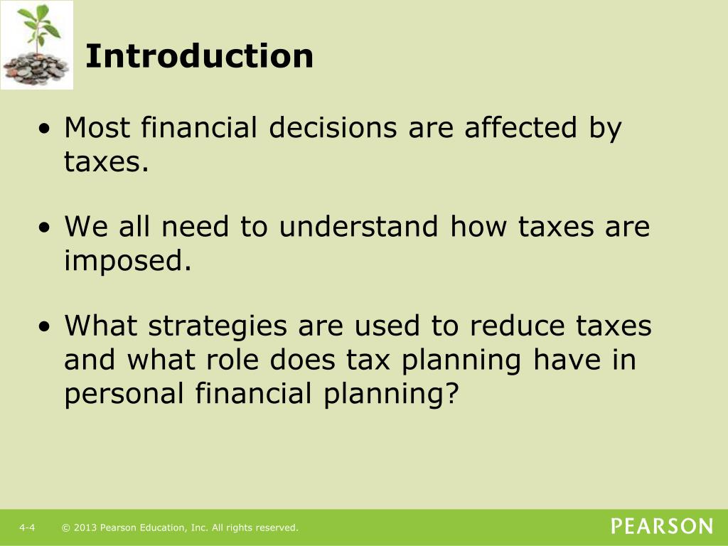 Introduction • Most financial decisions are affected by taxes. • We all need to understand how taxes are imposed. • What strategies are used to reduce taxes and what role does tax planning have in personal financial planning?
