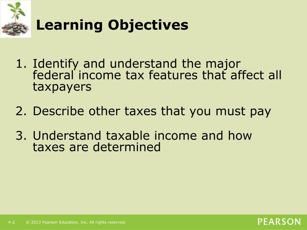 Learning Objectives • Identify and understand the major federal income tax features that affect all taxpayers • Describe other taxes that you must pay • Understand taxable income and how taxes are determined