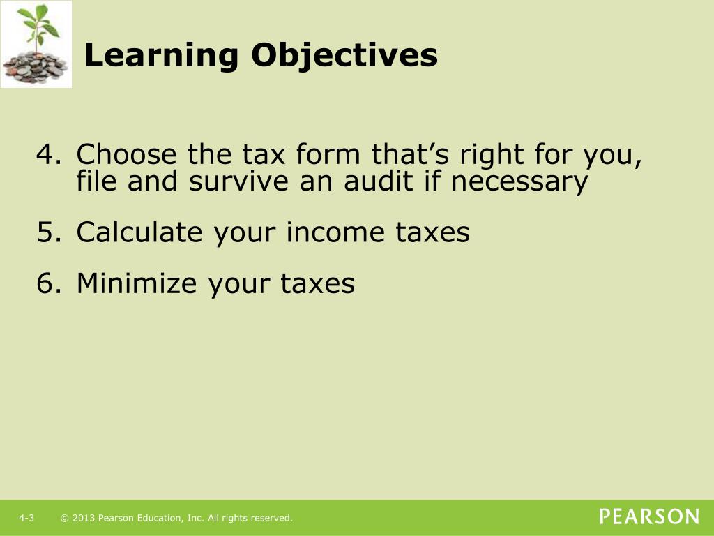 Learning Objectives • Choose the tax form that’s right for you, file and survive an audit if necessary • Calculate your income taxes • Minimize your taxes
