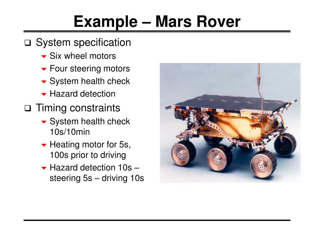 Example – Mars Rover • System specification • Six wheel motors • Four steering motors • System health check • Hazard detection • Timing constraints • System health check 10s/10min • Heating motor for 5s, 100s prior to driving • Hazard detection 10s – steering 5s – driving 10s