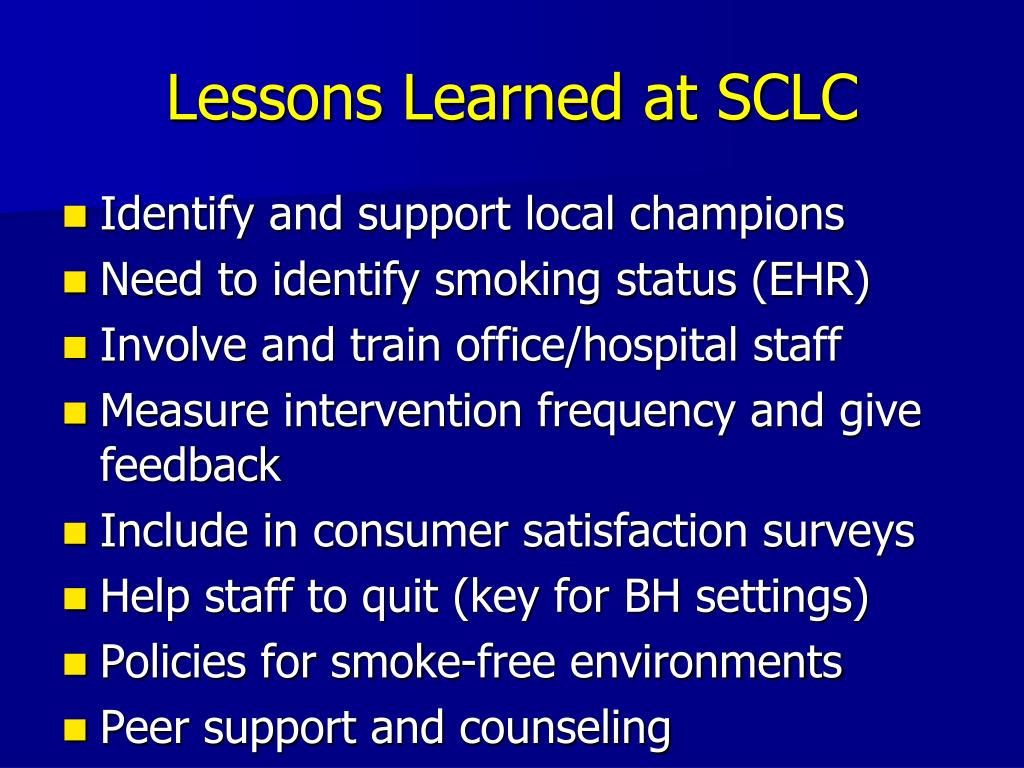Lessons Learned at SCLC • Identify and support local champions • Need to identify smoking status (EHR) • Involve and train office/hospital staff • Measure intervention frequency and give feedback • Include in consumer satisfaction surveys • Help staff to quit (key for BH settings) • Policies for smoke-free environments • Peer support and counseling